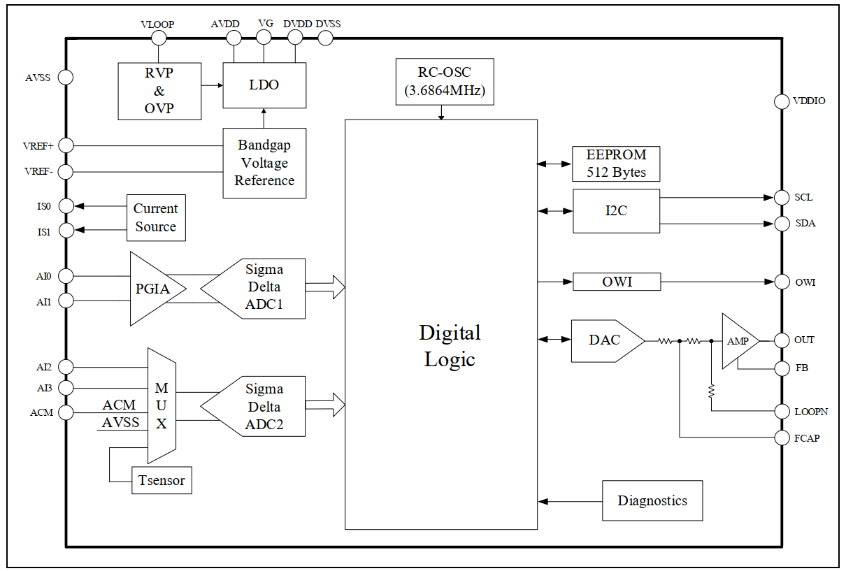 内置24bits ADC 2,支持1、2、4、8和16倍增益,外部单差分输入通道或两单端 输入通道,可切换至内部温度传感器输入通道